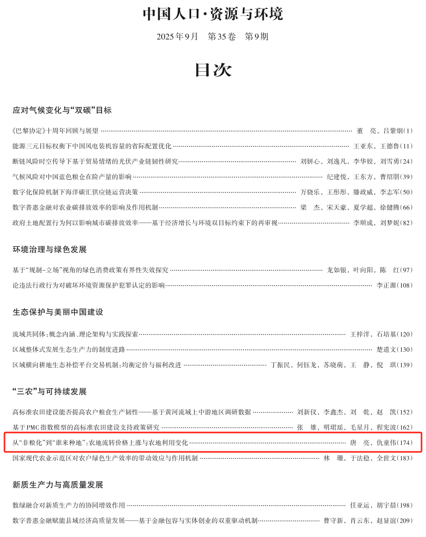 近日,我们青年研究员唐亮博士关于农地流转价格与农地利用关系相关研究发表在《中国人口·资源与环境》。农地流转市场化是优化农地要素配置,发展农业新质生产力的重要路径。然而,农地流转价格过快且不合理上涨正在加快农业生产成本的增加,严重影响了农业可持续发展。该研究利用2015—2023年中国家庭金融调查村庄数据,考察了农地流转价格与农地利用的关系。研究结果表明,农地流转价格与农地“非粮化”整体上具有正相关关系,但二者也存在倒“U”形关系。其原因在于,农地流转价格与农地闲置比例存在“U”形关系,即在拐点后农地闲置比例开始提高。换言之,农地流转价格的上涨在最初阶段会促进农地“非粮化”,但在达到拐点后,流转价格的持续上涨将开始加剧农地闲置,并诱发“谁来种地”的紧迫问题。进一步证据显示,农地流转价格上涨正在损害农民的种粮积极性,即农民在流转价格上涨过程中会转出农地并在剩余农地上进行多元化种植。而且,农地流转价格与农村外出务工劳动力比例呈“U”形关系,这一现象的形成原因在于,在拐点之前,新型农业经营主体对农村劳动力的农业就业具有一定的带动作用,而在拐点之后,流转价格上涨引发的农地转入主体退出和农地闲置降低了本地农业雇工需求,从而迫使农村劳动力向非农产业转移。为应对农地流转价格过度上涨引发的系统性风险,应该统筹规划补贴政策、产品价格政策和要素价格政策,并加快建设政府主导型和战略后备型农业经营体系,着力培育保障国家粮食安全和重要农产品稳定安全供给的国家队,筑牢防范农地“非粮化”和“无人种地”的最后一道防线。